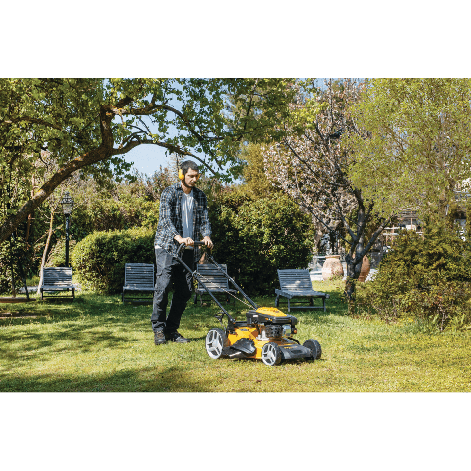 El ajuste central de altura de corte en 7 posiciones (25-85 mm) permite adaptarla a las condiciones del césped. El depósito de 1 litro y el recogedor de césped de tela de 65 litros ofrecen gran autonomía y comodidad. Las ruedas con rodamientos de bolas (200 mm delante, 280 mm detrás) garantizan una maniobrabilidad suave incluso en superficies irregulares.