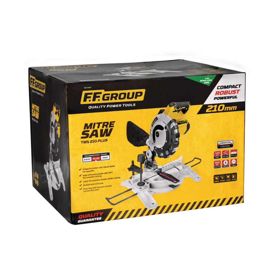 Cortes precisos, rápidos y seguros. La sierra ingletadora FF GROUP TMS 210 PLUS es la herramienta ideal para trabajar con madera, plástico y materiales compuestos. Equipada con un potente motor de 1500 W y una hoja de 210 mm , garantiza cortes limpios y angulares con la máxima precisión.